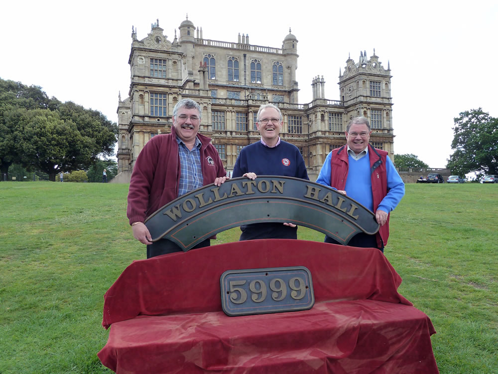 Pat Morriss, Chairman of the Friends of the Cromford Canal, Peter Stone and Mike Stone, Chairman of the Grantham Canal Society, admire the locomotive plates in front of historic Wollaton Hall